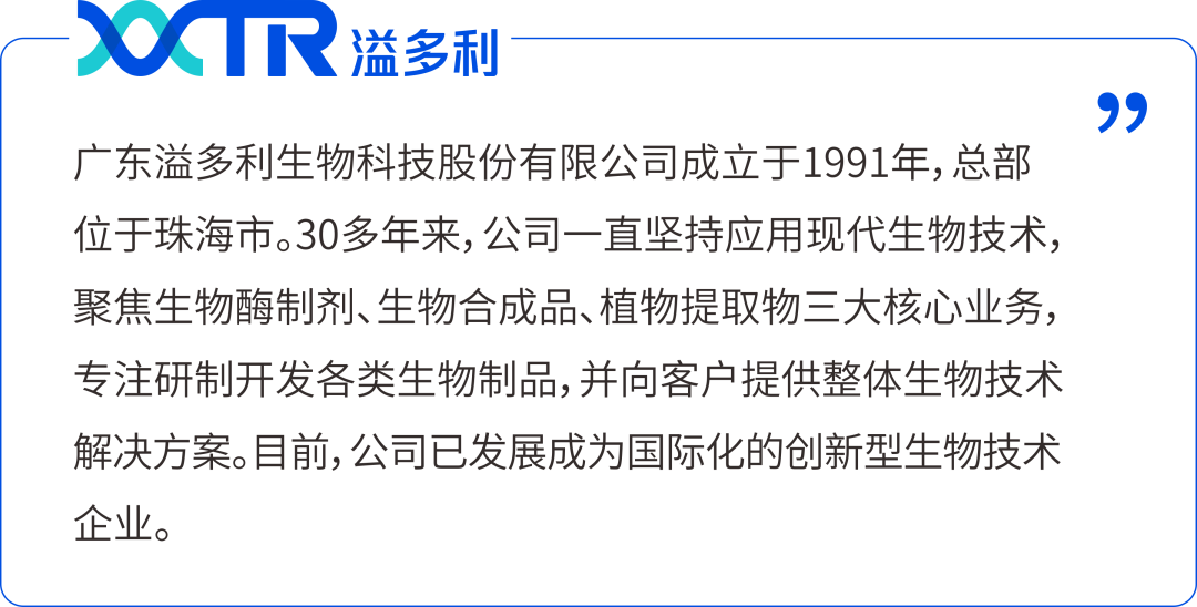 溢多利自1991年成立以來,一直堅持應用現代生物技術,聚焦生物酶制劑、生物合成品、植物提取物三大核心業務,專注研制開發各類生物制品,并向客戶提供整體生物技術解決方案,積極提升人類生活品質!